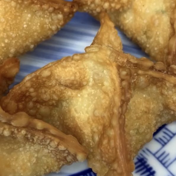 Heat some neutral flavour frying oil in a pot over medium heat. Fry the crab rangoons until they are a deep golden brown. Approximately 3 minutes.